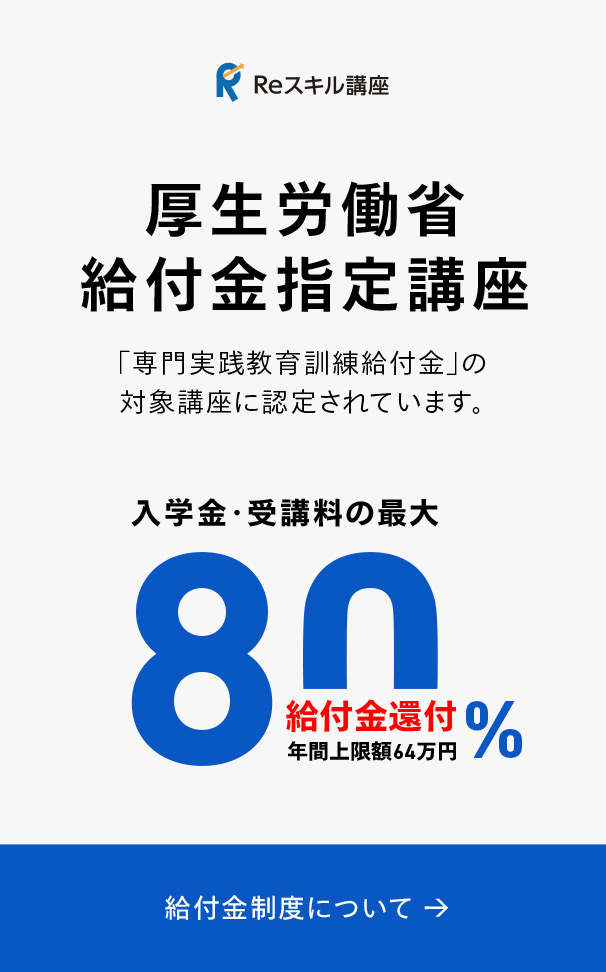 教育給付金の対象となっており、一定の要件を満たす場合、入学金・受講料の最大80%(年間上限64万円)の還付が受けられます。